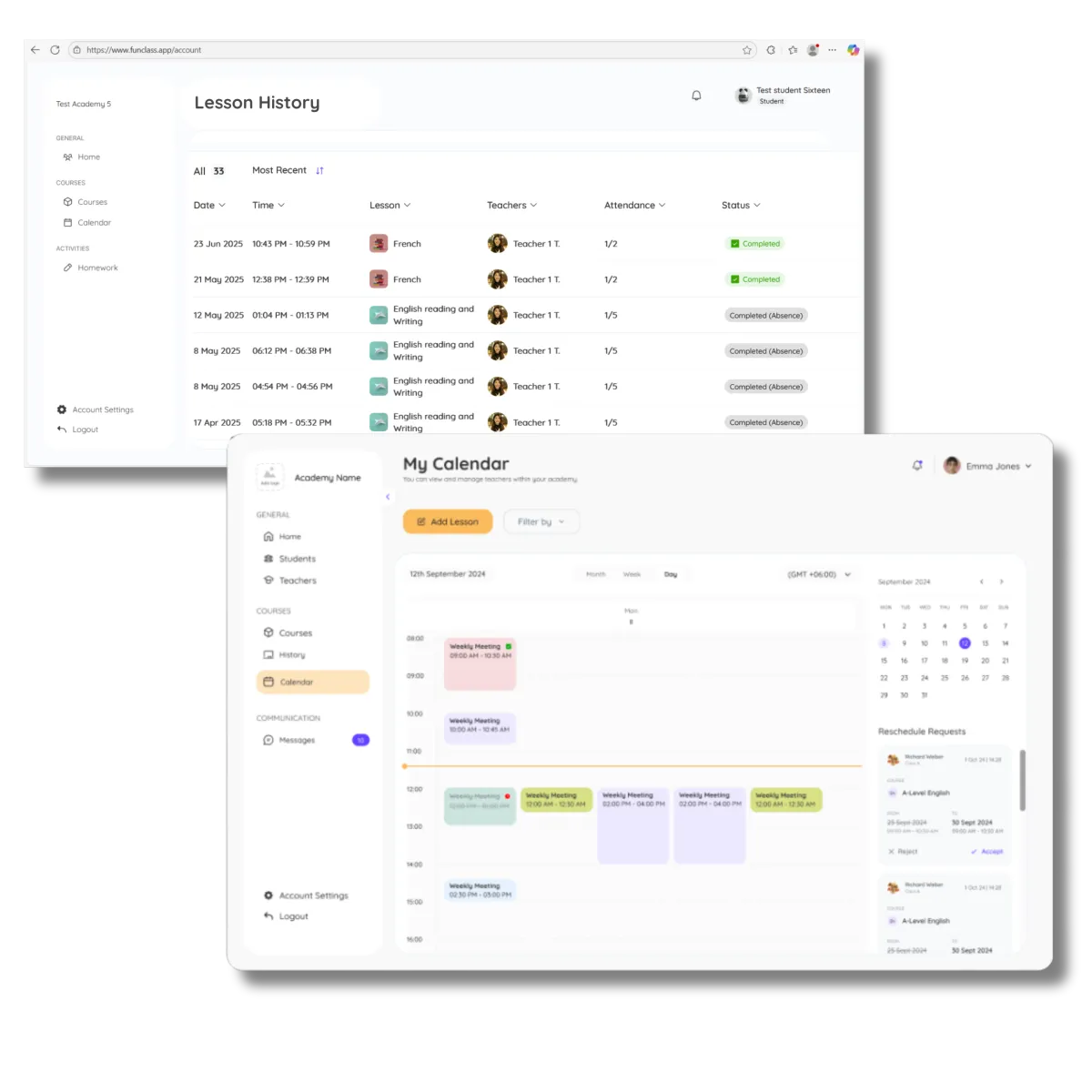Stay on top of your lessons and business operations in one place. From course creation and scheduling to payments and student progress, Funclass gives you a clear view of what matters most, so you always know your next priority.