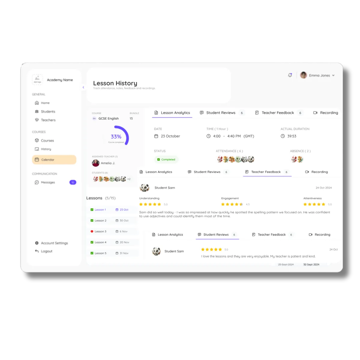 Organised, accessible, automated. Every class is tracked and shared automatically - attendance, notes, feedback, and recordings all stored in one place, giving tutors instant clarity and families lasting confidence.