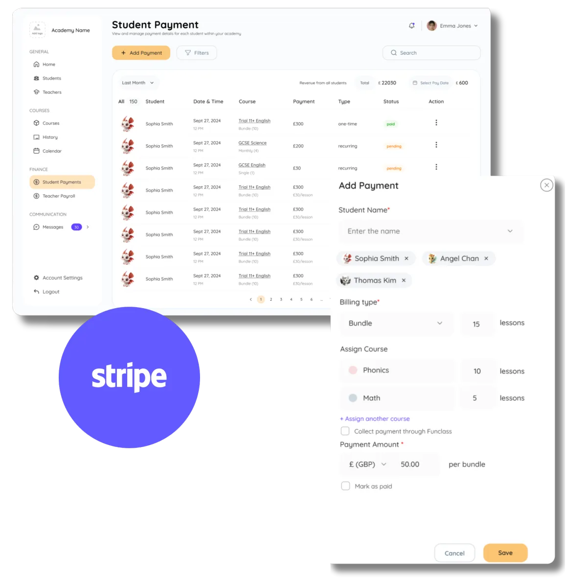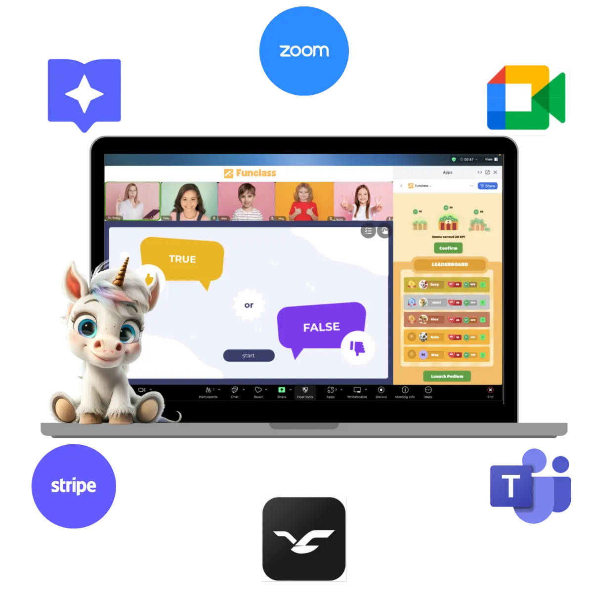 Funclass keeps you teaching where you’re comfortable — simply embed your preferred classroom link. From there, admin takes care of itself: payments, homework tracking, and feedback are all streamlined, while gamified rewards keep learners engaged and parents impressed.