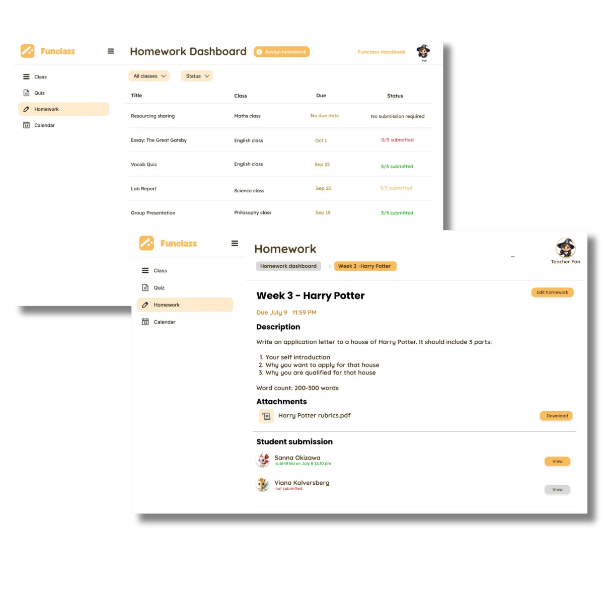 Share assignments with supporting materials, set due dates, and let students submit homework directly through Funclass. Review, grade, give feedback, and reward effort, all in one place.