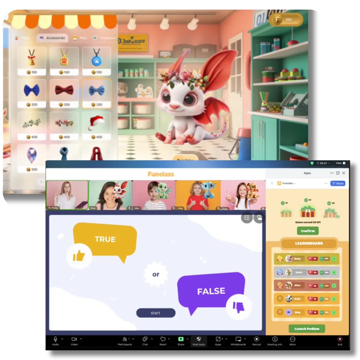 Funclass rewards plug into any lesson, giving students their own portal to raise, evolve, and celebrate progress with their magical pet.